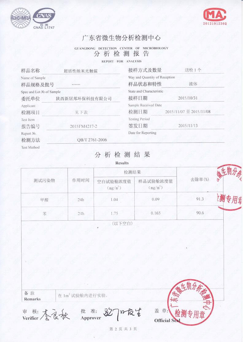 立美凈除醛凈味雙效觸媒除醛效率檢測報告